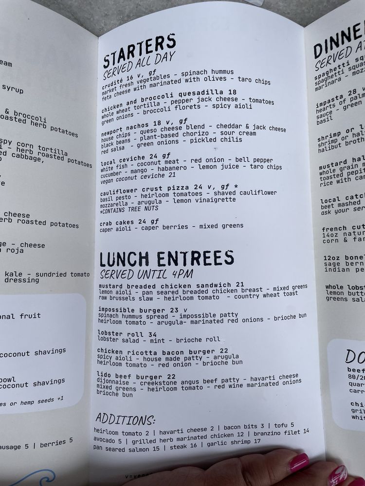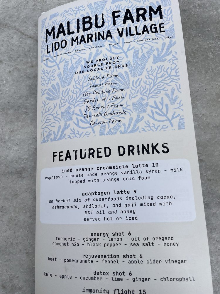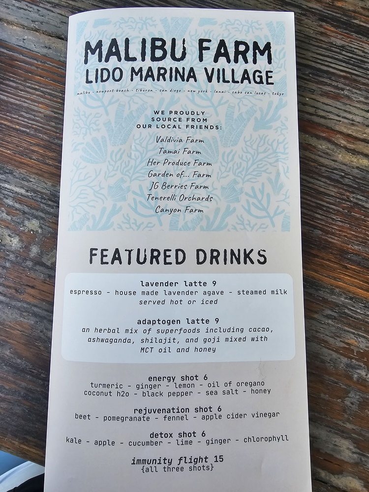 Malibu Farm Lido in Newport Beach offers a diverse menu with a focus on New American cuisine, breakfast, brunch, and sandwiches. The restaurant provides a range of amenities such as Wi-Fi, outdoor seating, and a full bar, catering to a variety of dining preferences. Customers praise the stunning waterfront location and the attentive service, with particular mention of standout dishes like the Branzino tacos and nachos. The restaurant's commitment to sustainability is evident through its use of compostable containers and plastic-free packaging. Overall, Malibu Farm Lido exudes a trendy, upscale atmosphere perfect for a relaxing meal with friends or family. Whether you're looking for a casual brunch spot or a romantic dinner setting, Malibu Farm Lido offers a memorable dining experience in California.